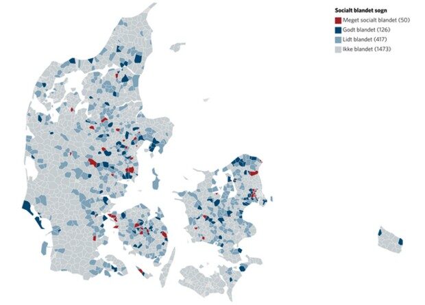 Det viser en ny analyse fra Arbejderbevægelsens Erhvervsråd, der har undersøgt de sociale klassers størrelser i de 2066 sogne med mindst 100 indbyggere. I analysen er sognene inddelt i ”meget socialt blandet”, ”godt blandet”, ”lidt blandet” og ”ikke blandet” baseret på, hvordan de enkelte klasser er repræsenteret i forhold til på landsplan.